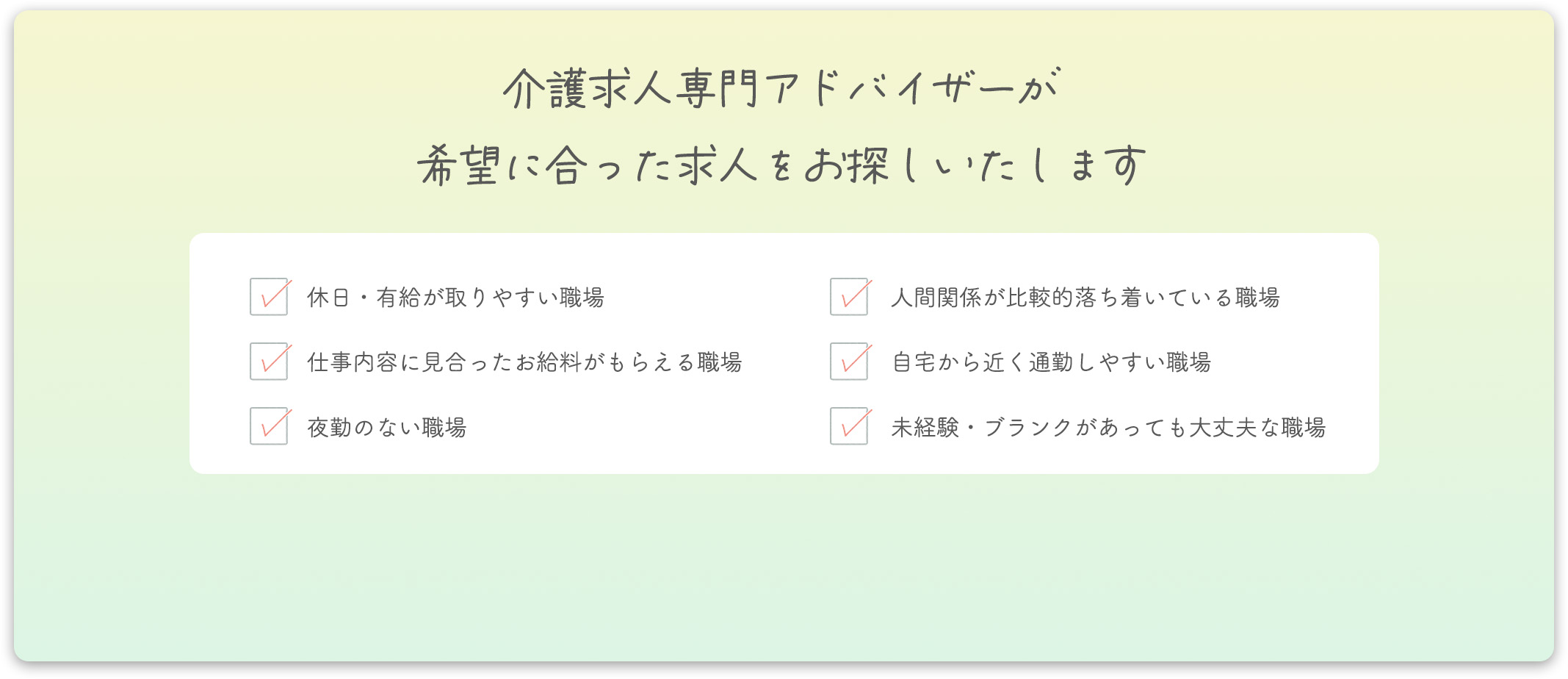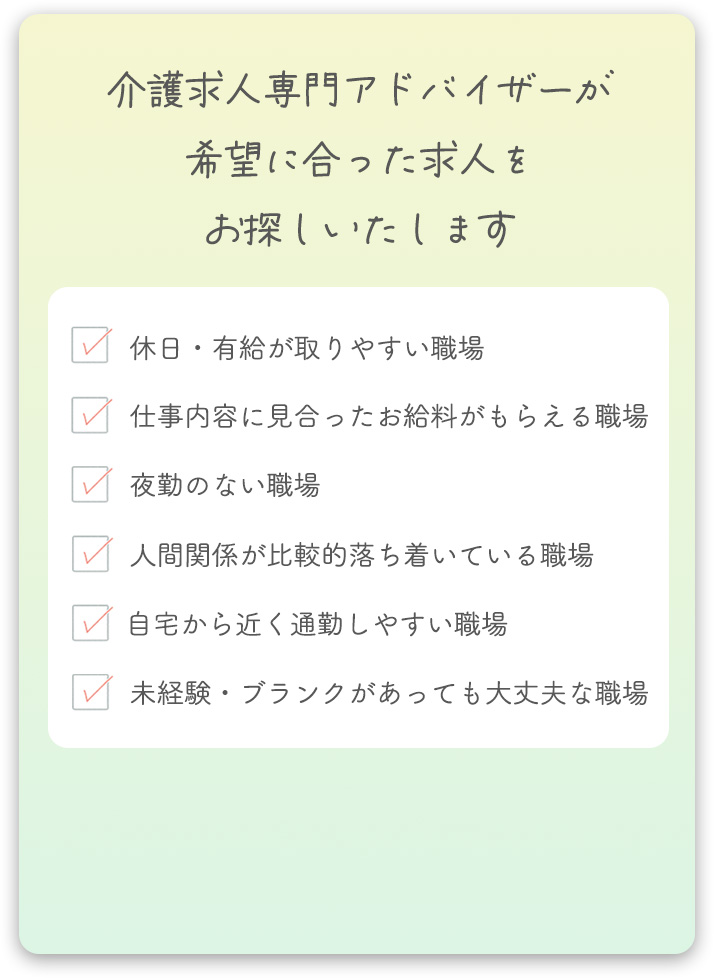 2026年03月15日現在、今の職場に不満がある方からの相談がたくさん来ております。今の介護職場、このままでいいかなぁと思ったら、まずはお気軽にご相談。無理な応募・転職の強要は一切ありません。相談だけでOK。2026年03月15日現在 今の職場に不満がある方からの相談がたくさん来ております。今の介護職場、このままでいいかなぁと思ったら、まずはお気軽にご相談。無理な応募・転職の強要は一切ありません。相談だけでOK。